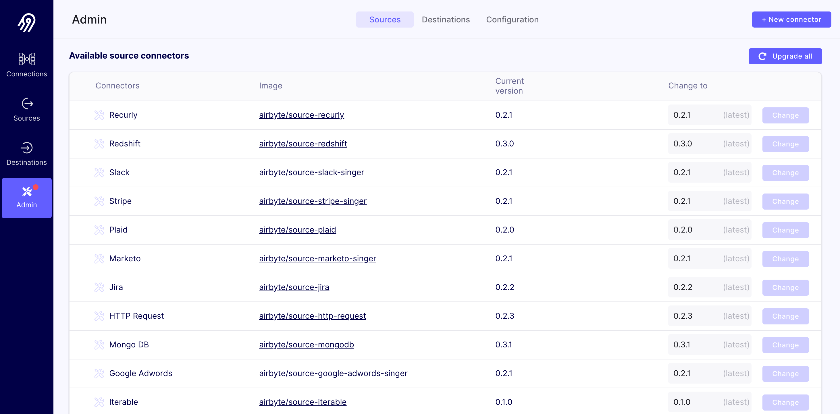 To upgrade your connector version, go to the admin panel in the left hand side of the UI, find this connector in the list, and input the latest connector version.