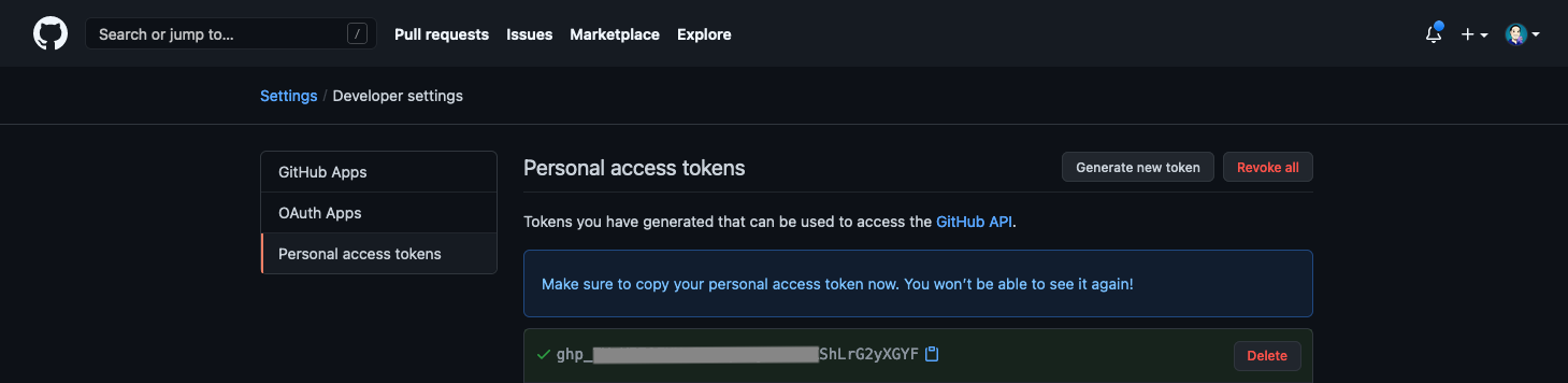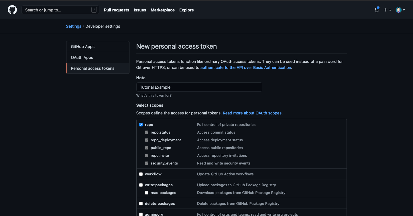 As an example, I go through my GitHub account to generate a Personal Access Token to use in Airbyte with permissions to clone my private repositories: